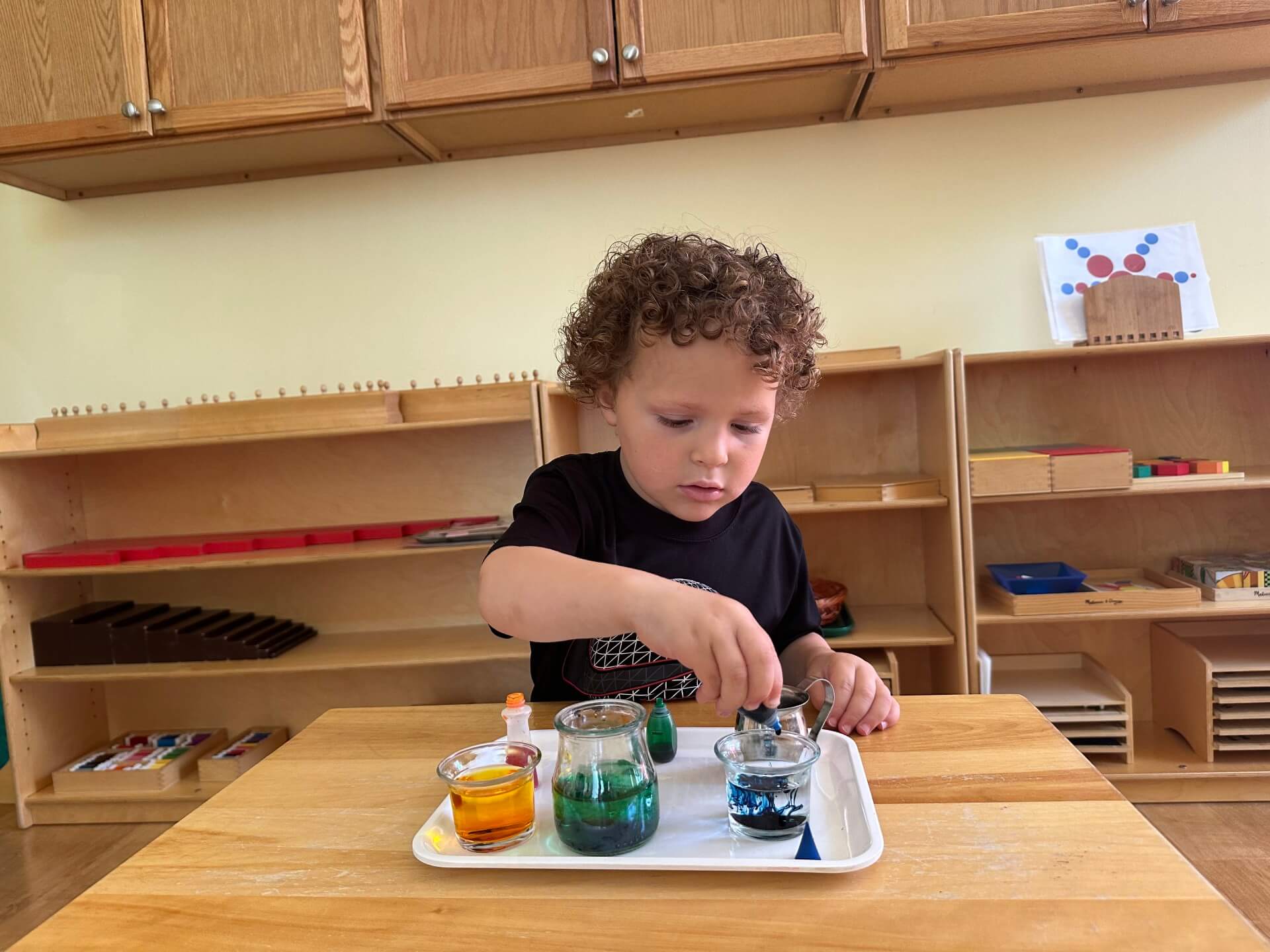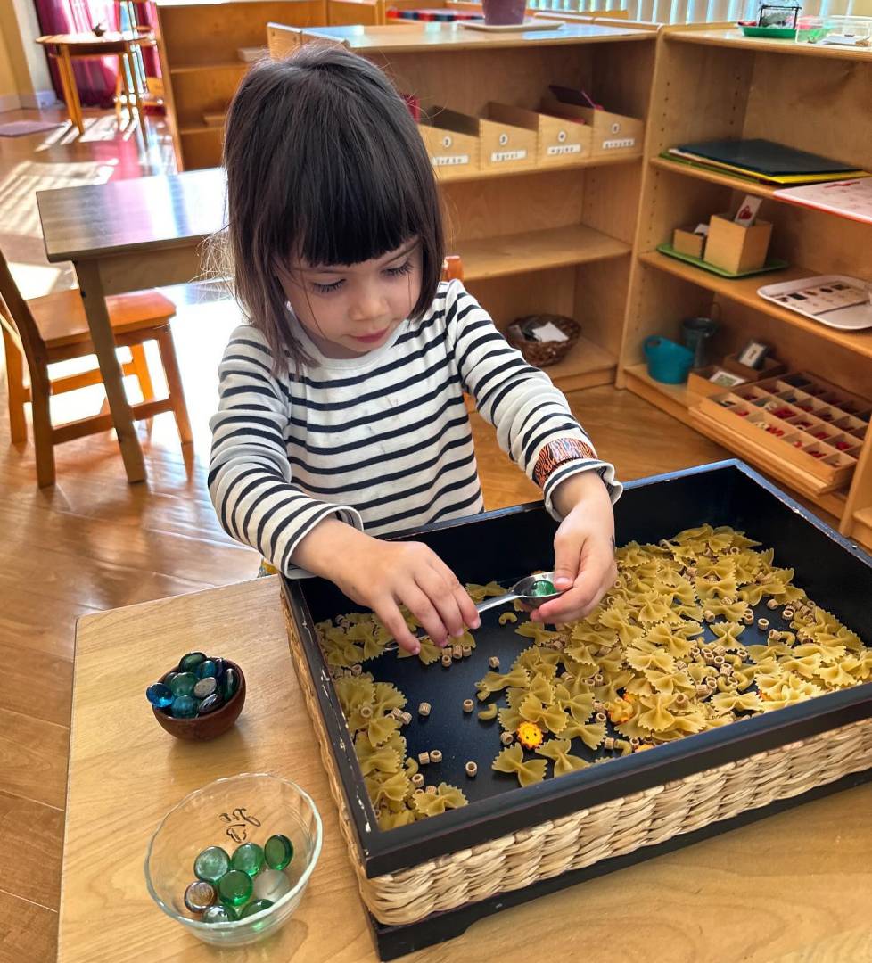 - Practical Life: engaging childrenc in activities designed to teach them how to take care of their needs (dressing, cleaning themselves) taking care of their environment (food preparation, serving themselves, cleaning their mess, sweeping, watering plants, cutting, pouring) and developing social skills (greeting, apologizing, using manners, talking softly).